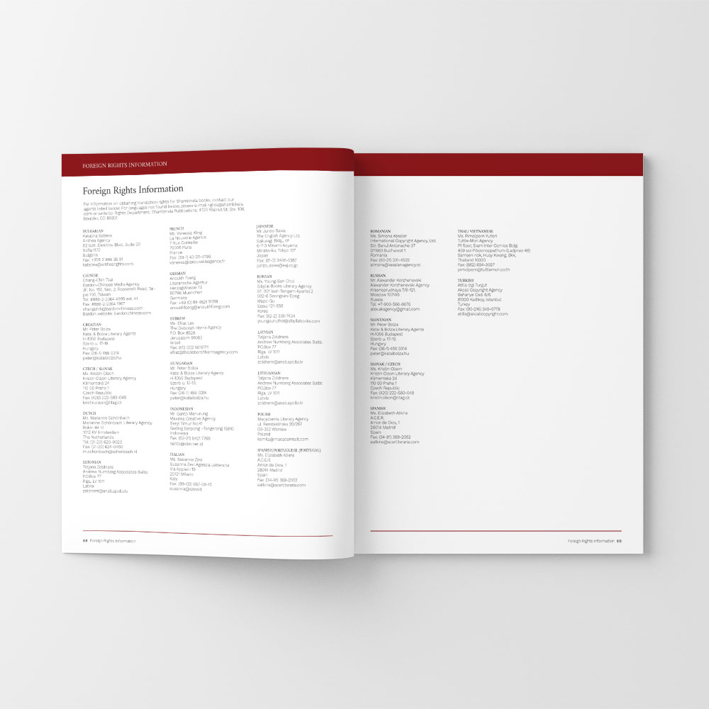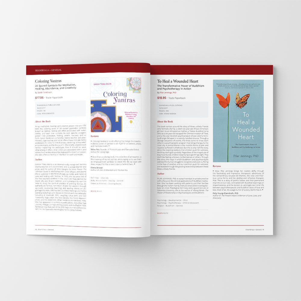 Shambhala Publications requested a tradeshow brochure to match their website. The biggest challenge was varying amounts of copy for each of the 84 books.
